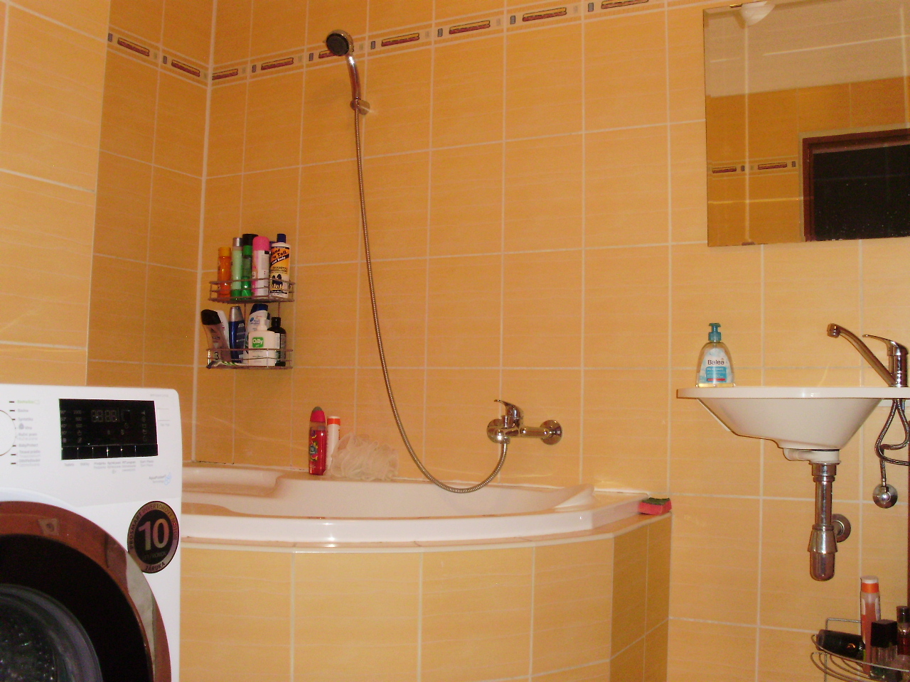 Koupelna s rohovou vanou, samostatné WC a spíž. Nové podlahy, dveře, plastová