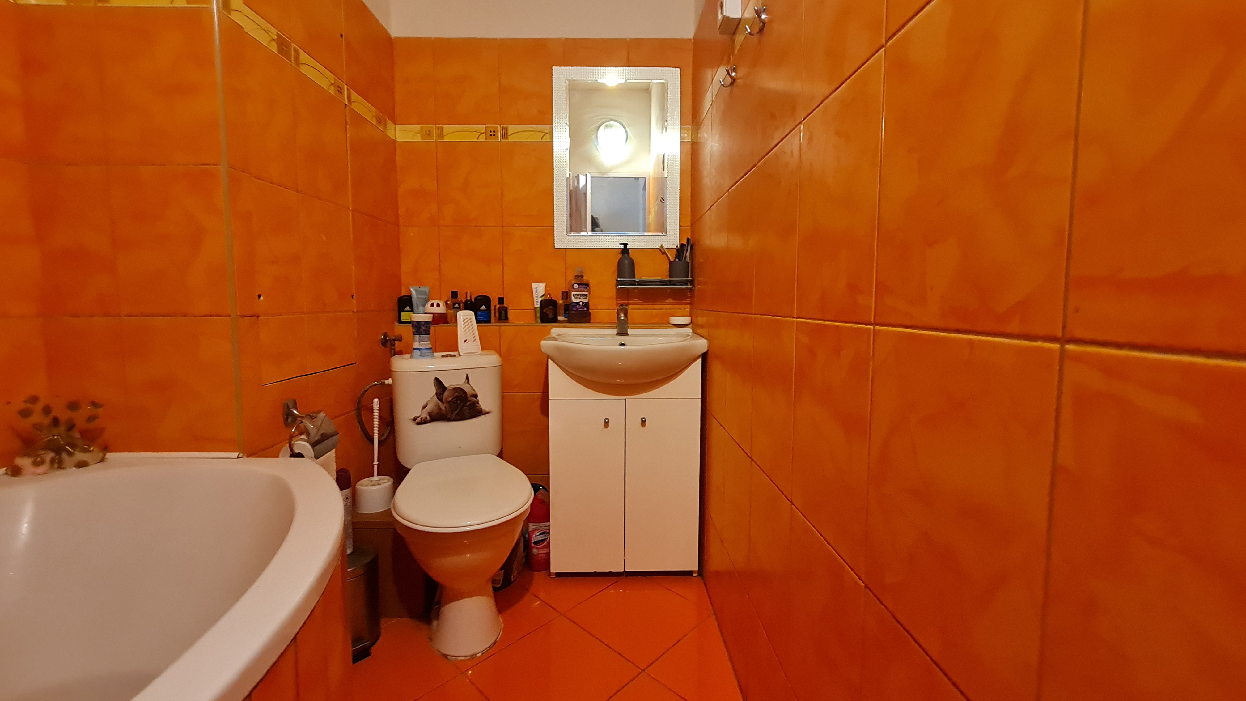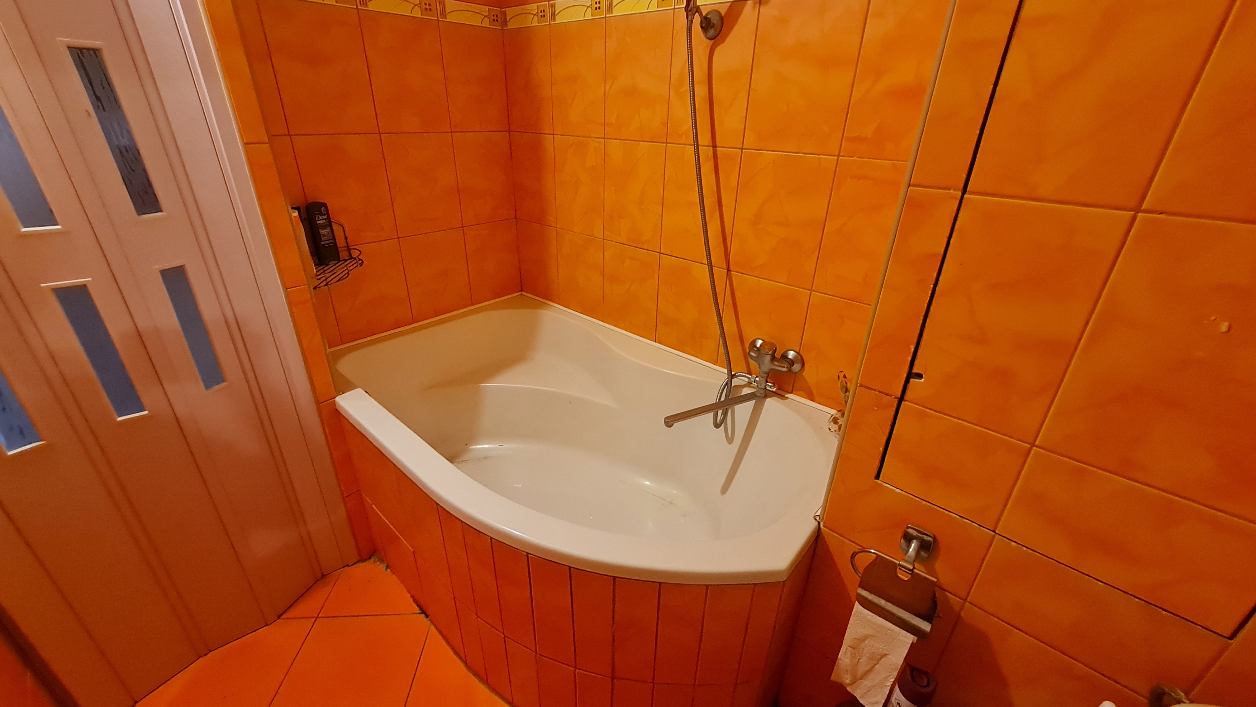 koupelna s rohovou vanou a WC. V bytě jsou plastová okna, plovoucí