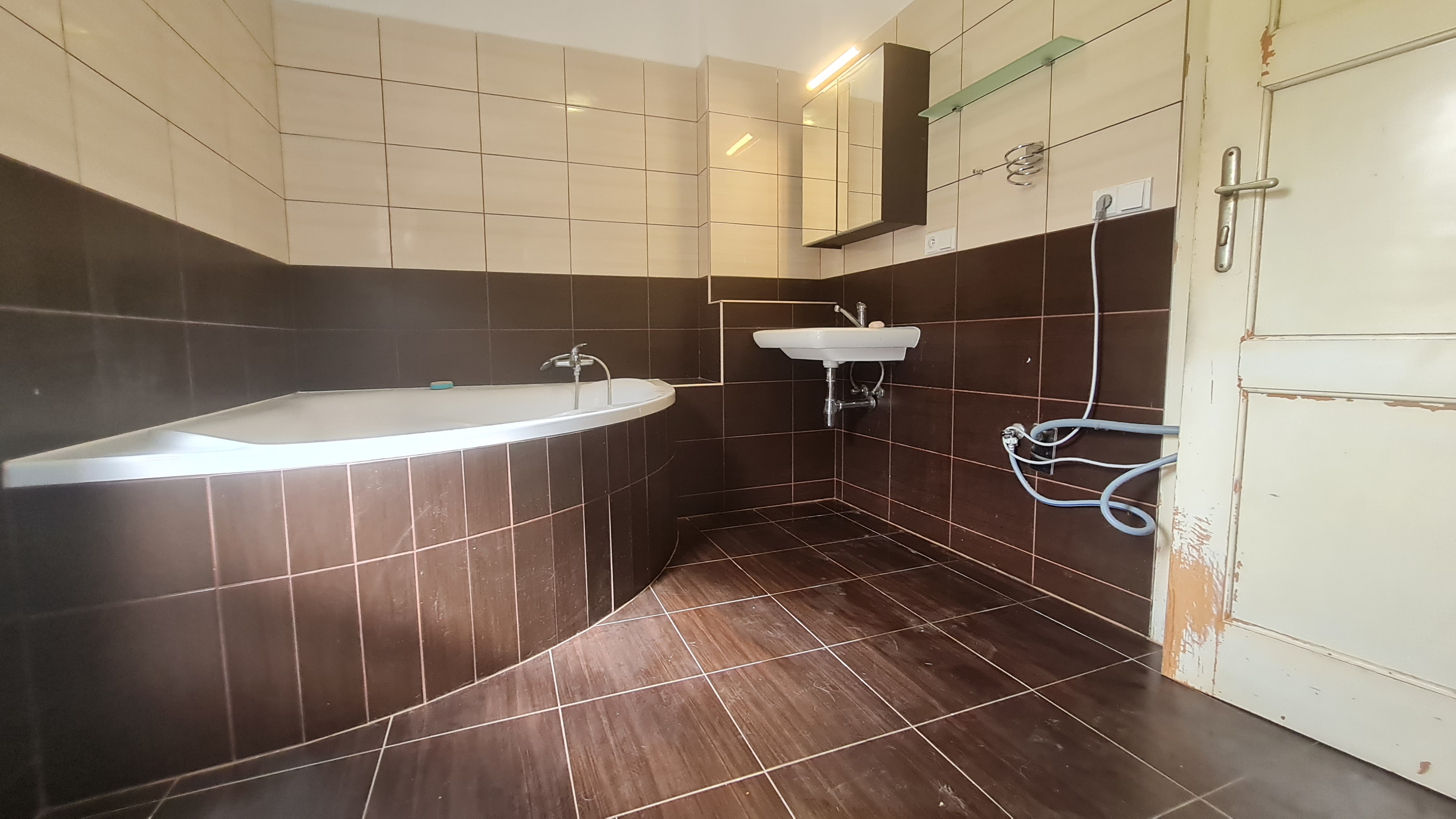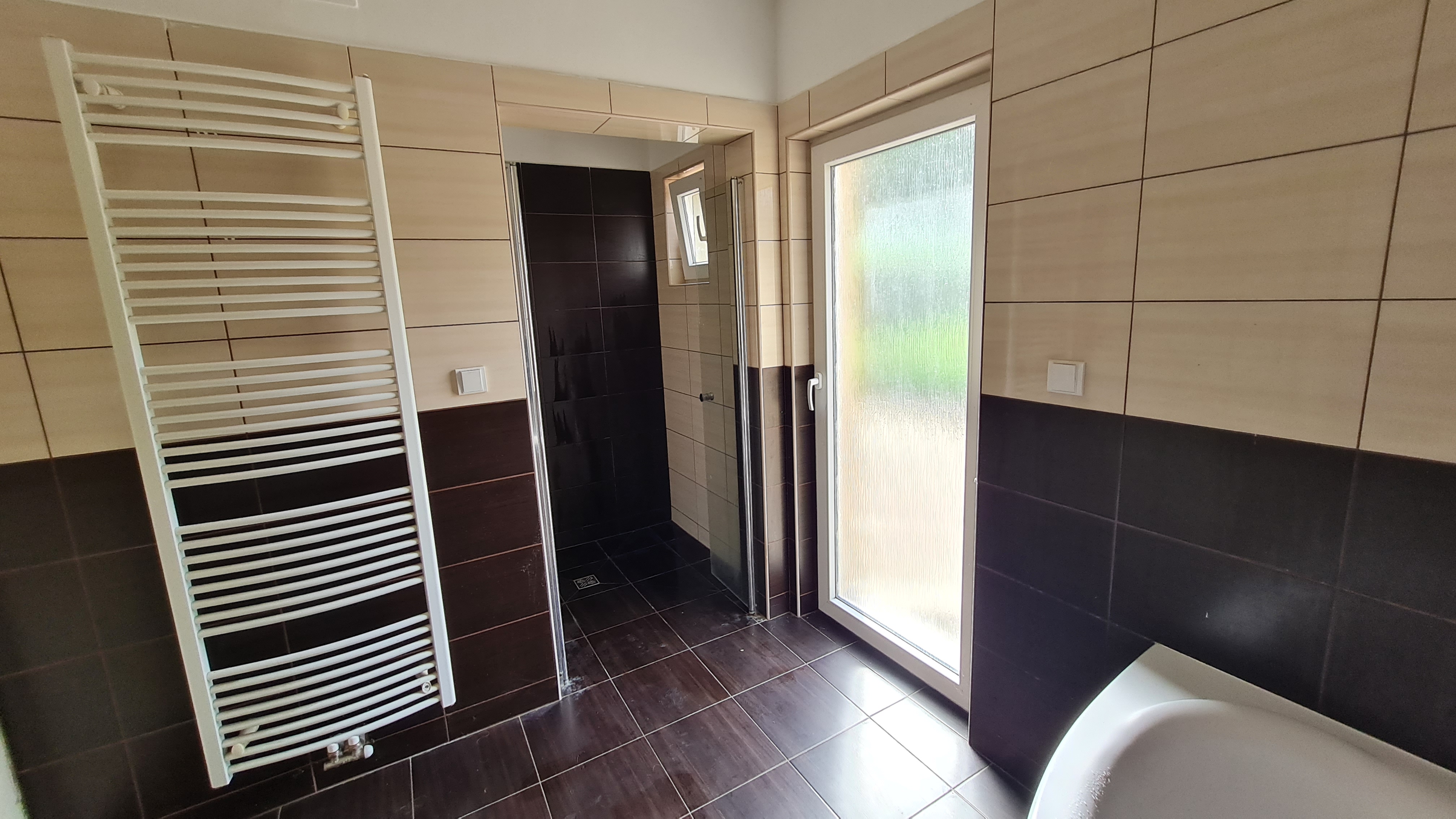 domu koupelna s rohovou vanou a sprchovým koutem (z koupelny je vstup na