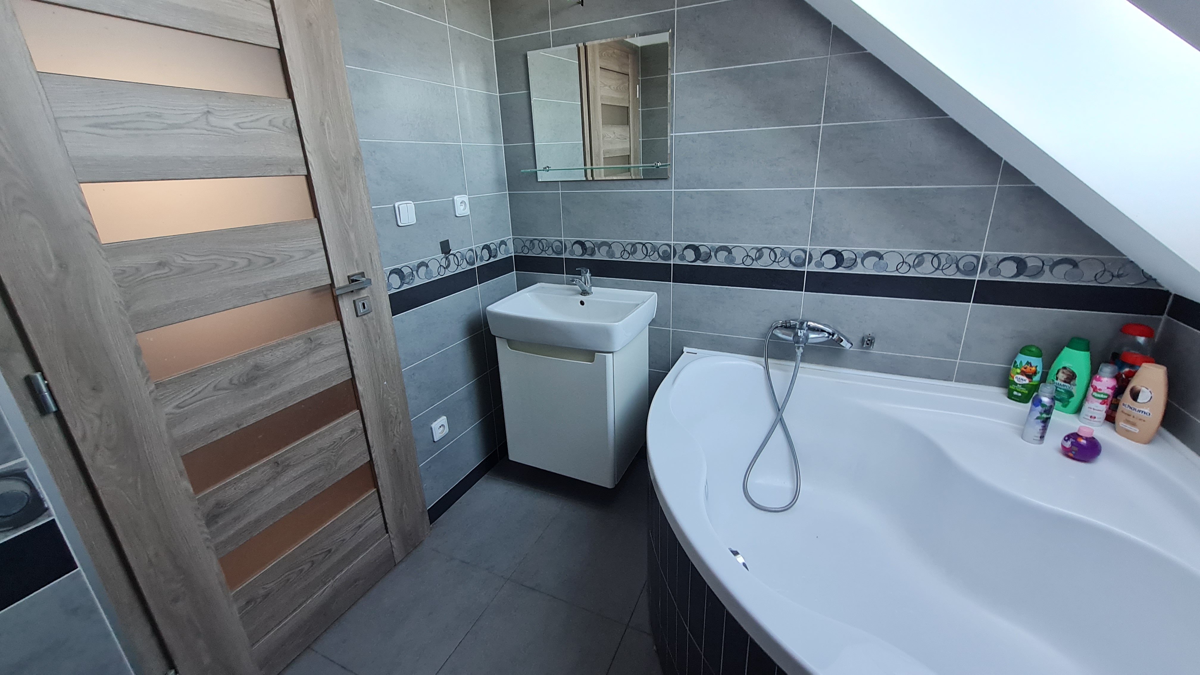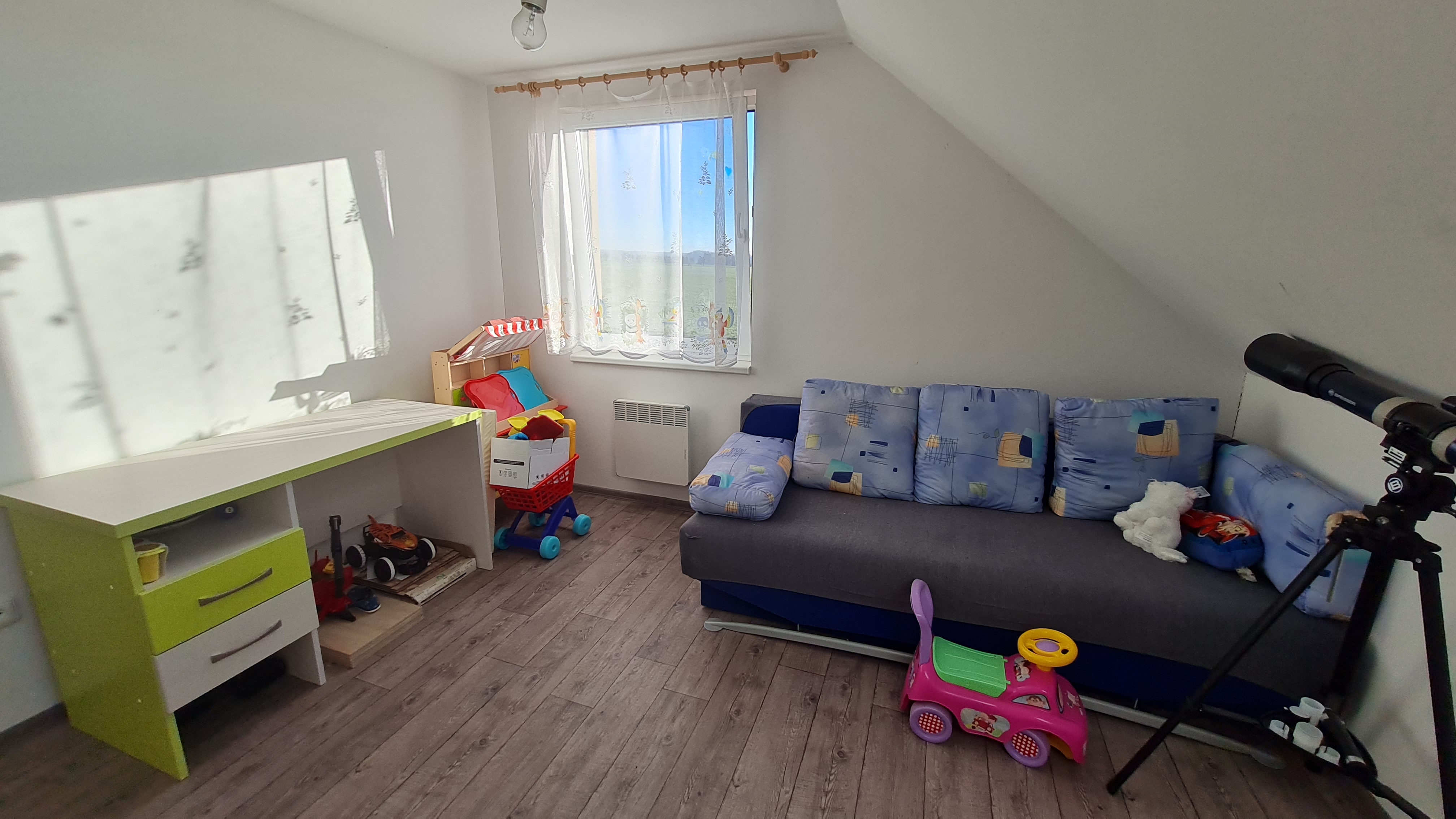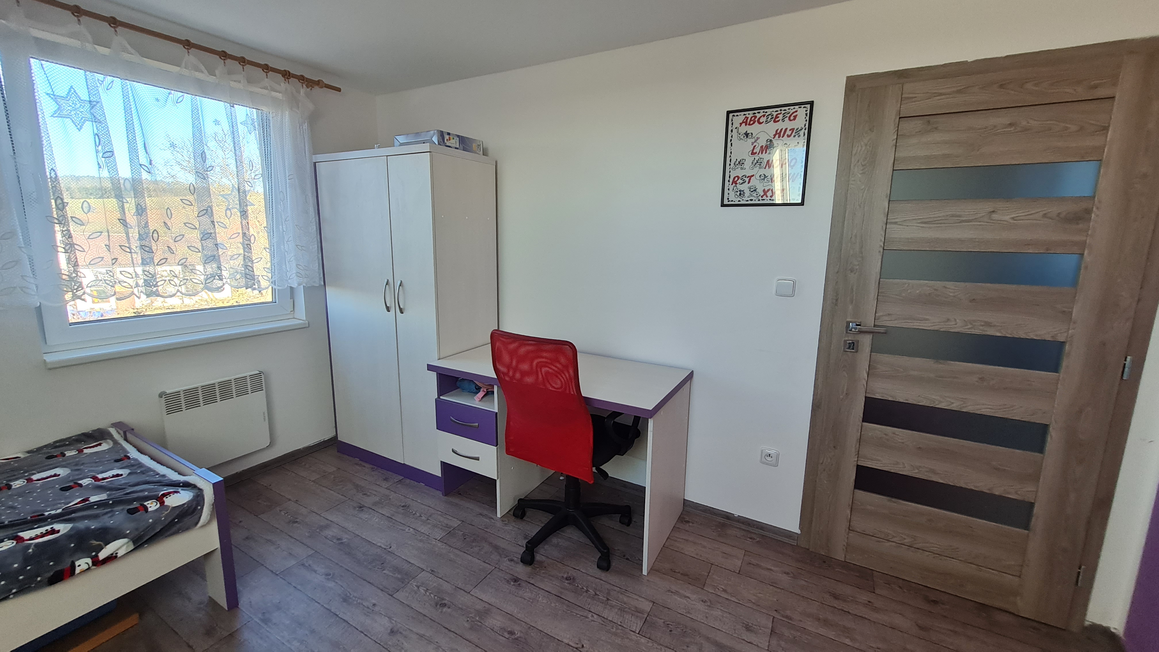 nalezneme chodbu, dva dětské pokoje, ložnici, šatnu, koupelnu s rohovou