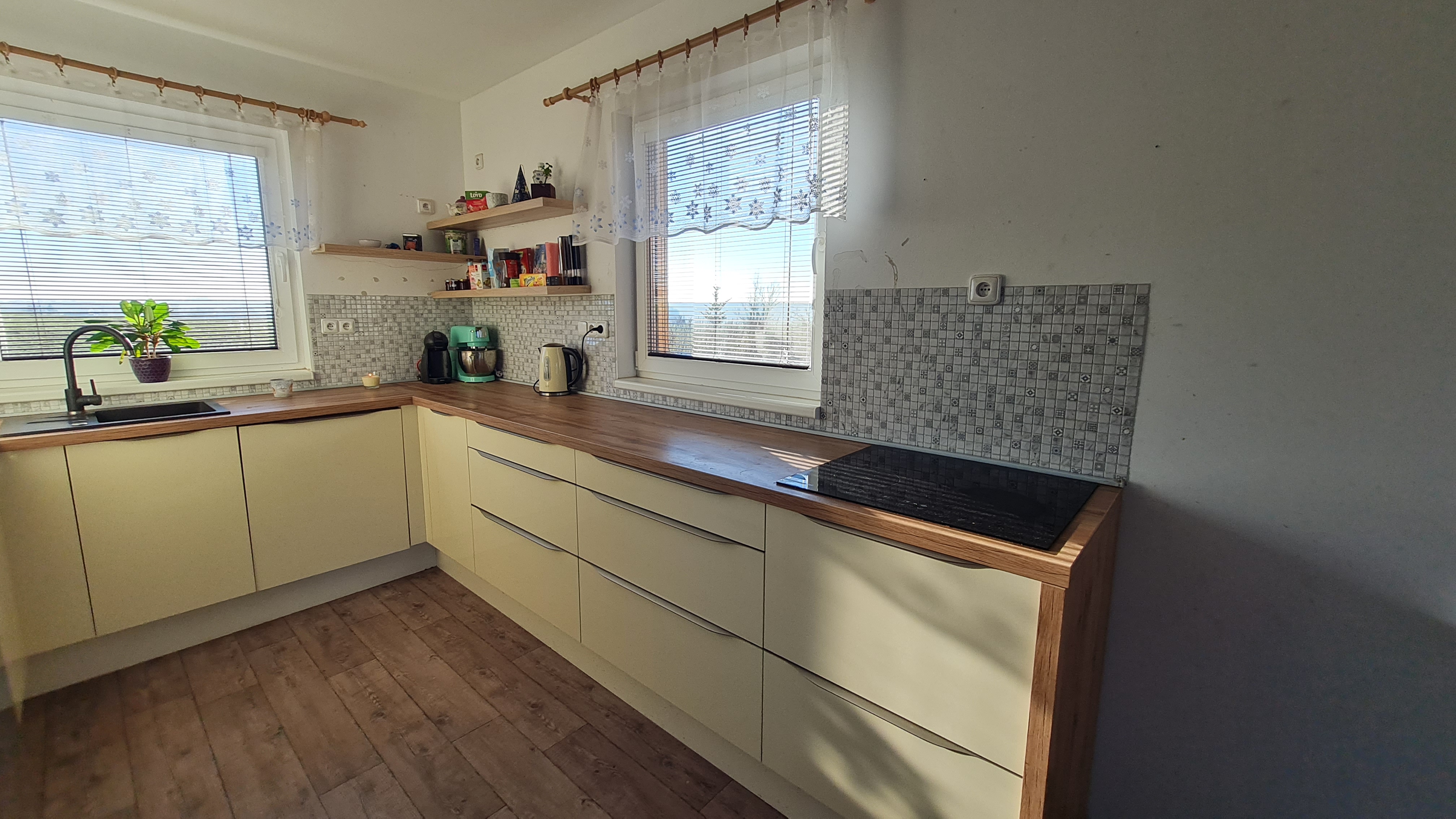 a dále na zahradu. Kuchyňská část je vybavená kuchyňskou linkou na míru s