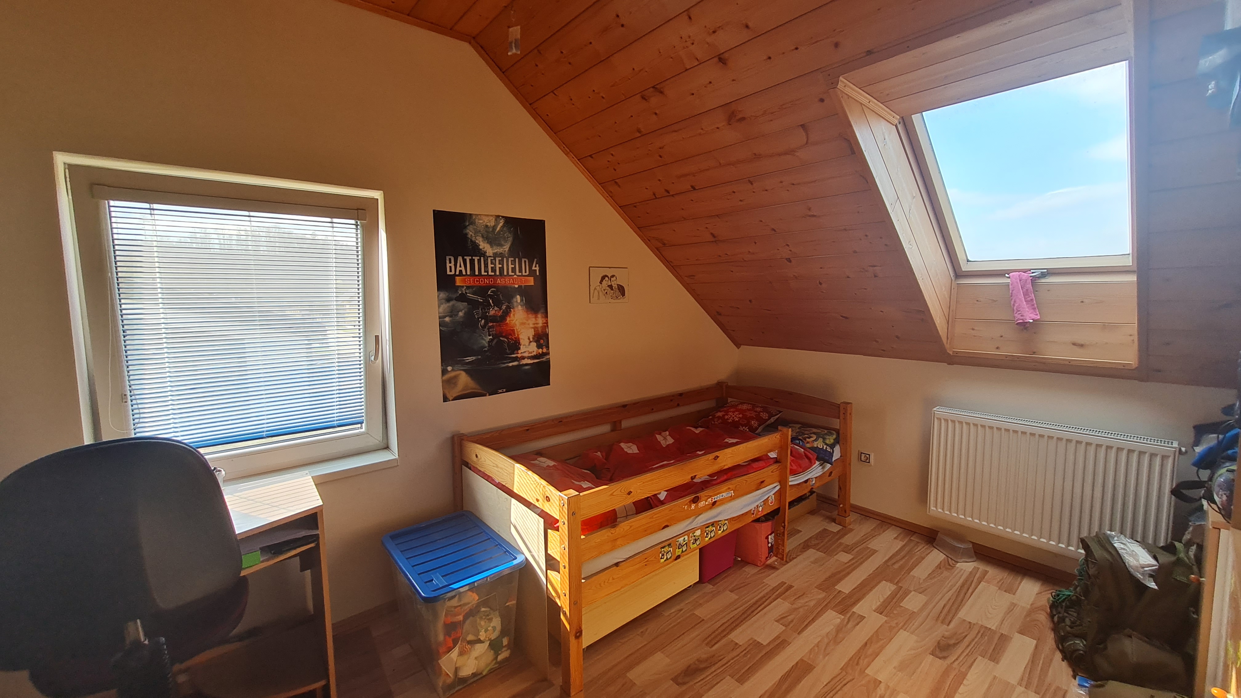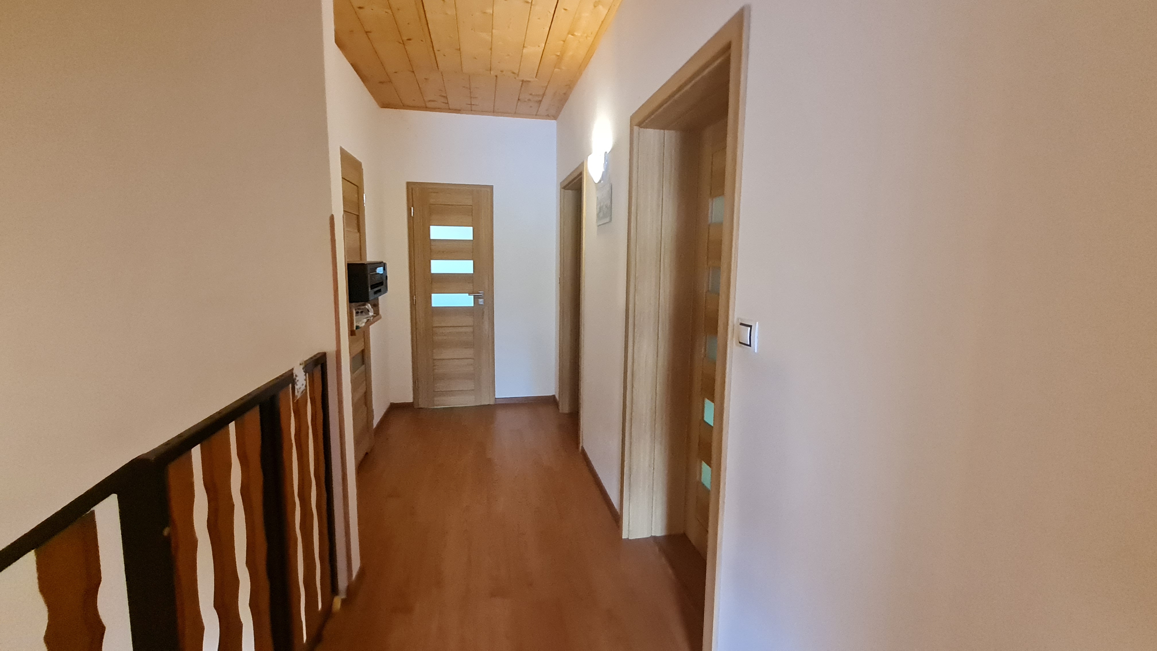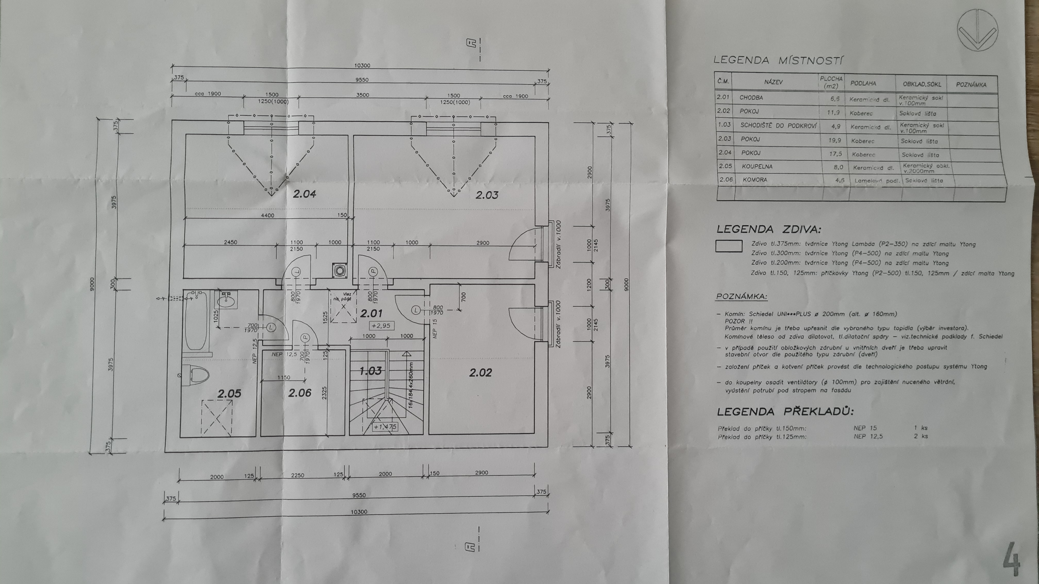 dětské pokoje, ložnice, koupelna s vanou, toaletou a komora. Na půdu