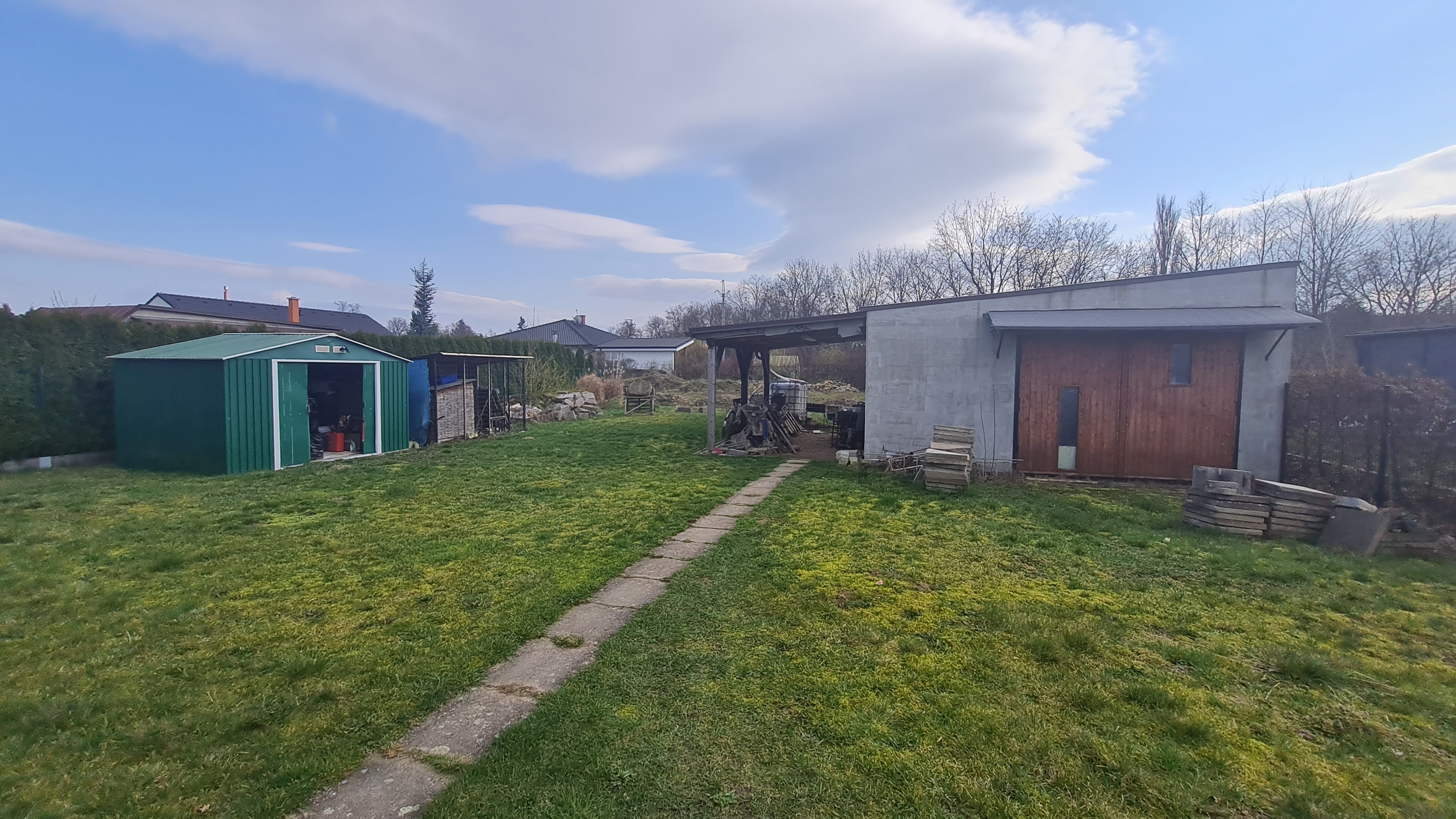 garáží pro dvě auta a přístřeškem. Celková plocha pozemku je 738 m2, z