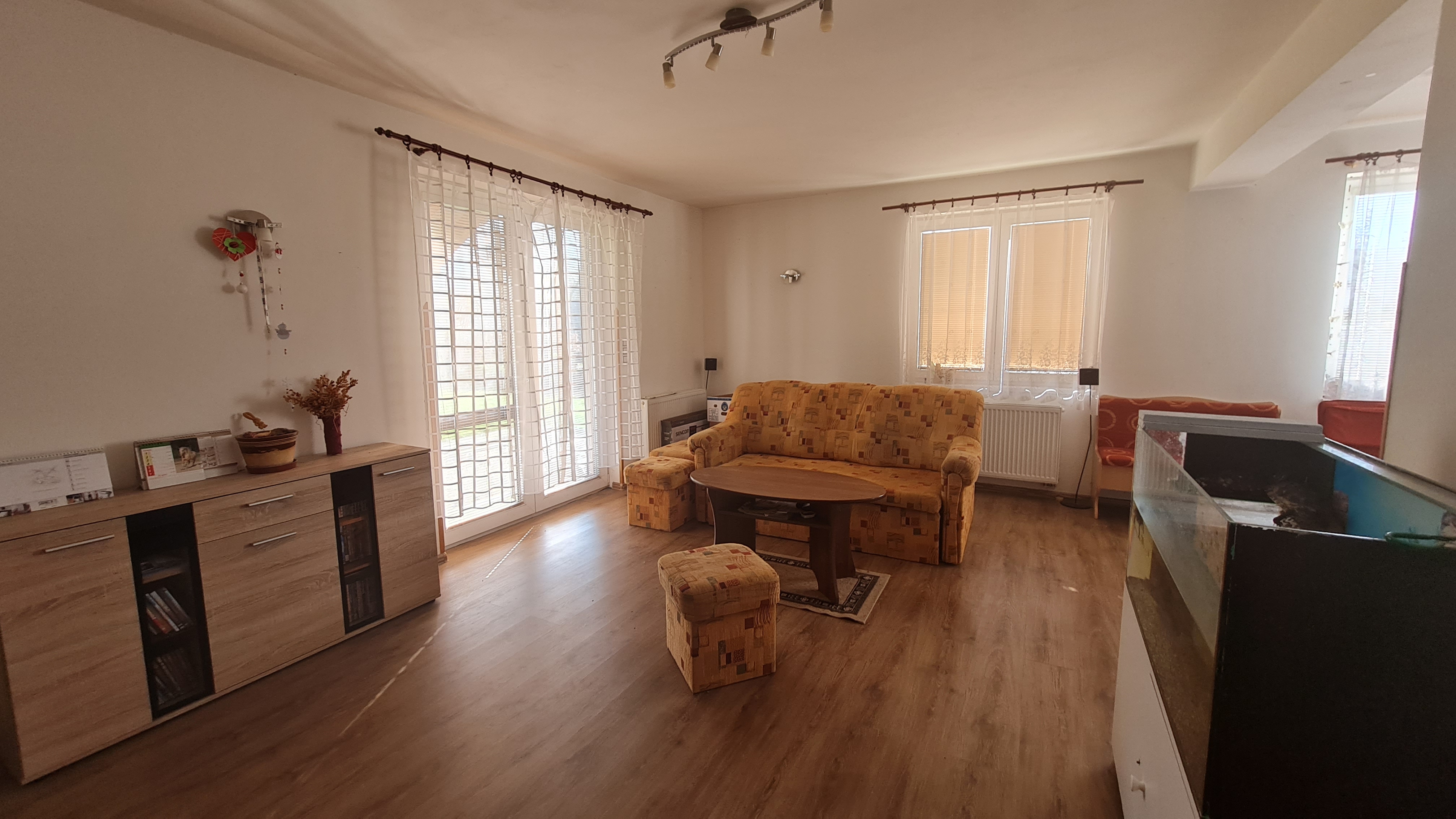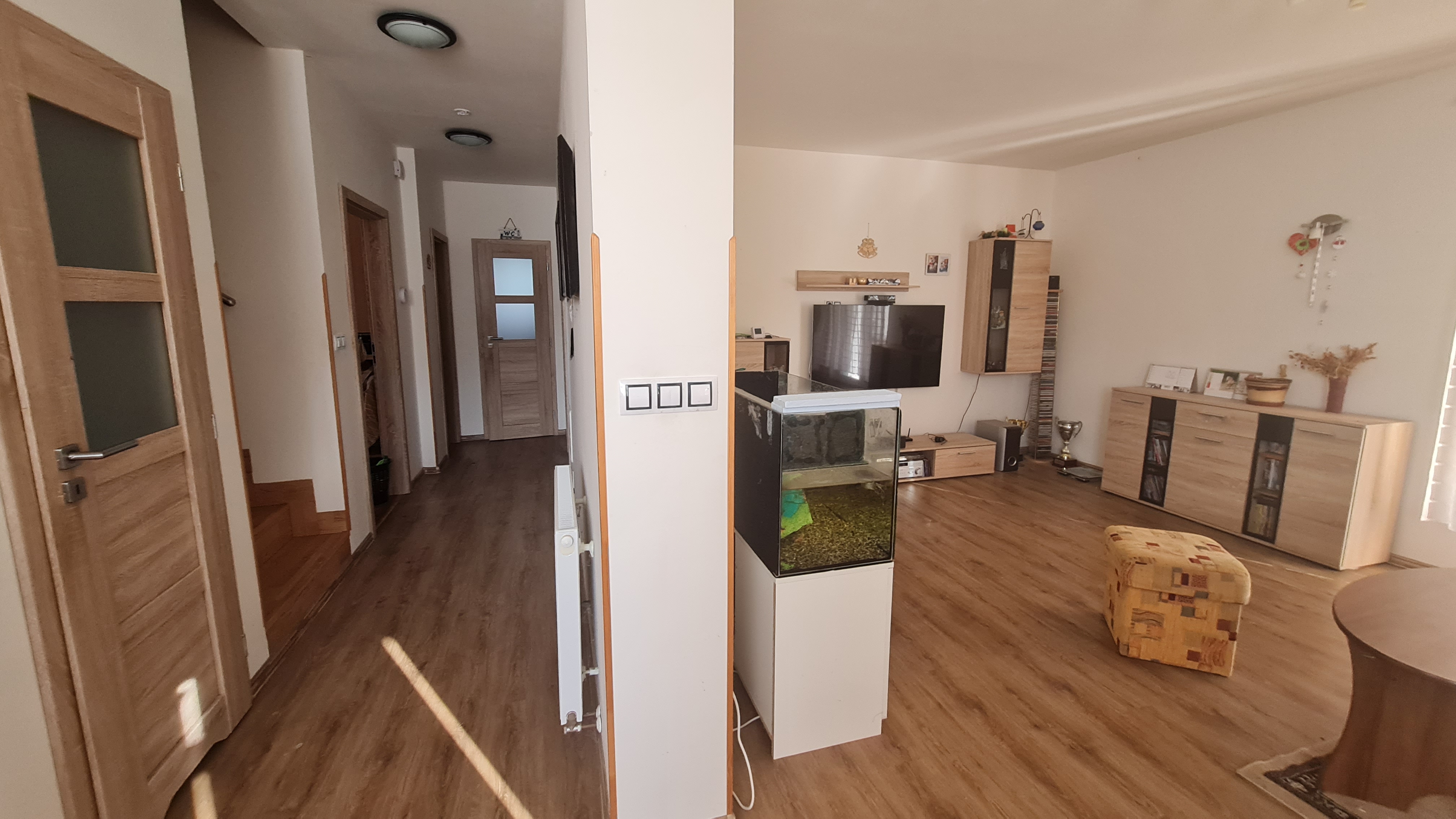 Obytná část domu se skládá ze vstupní chodby, prostorného obývací pokoje