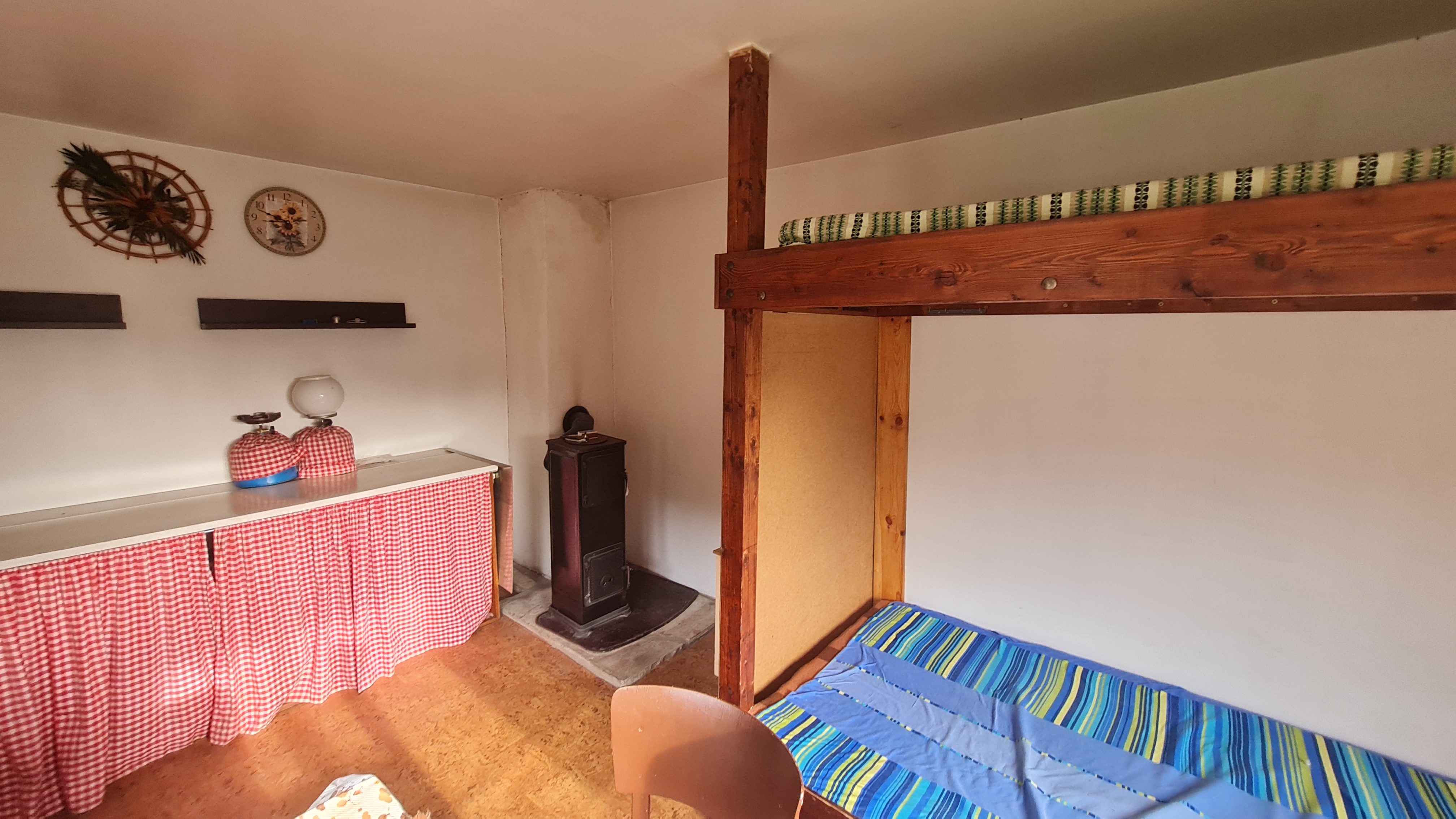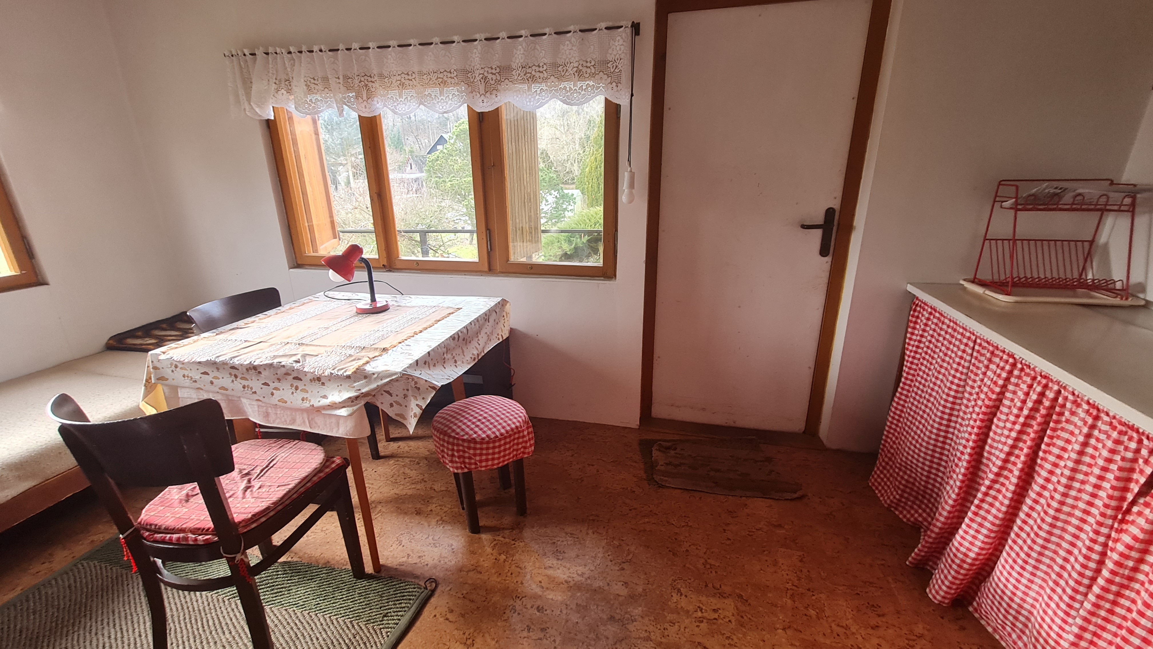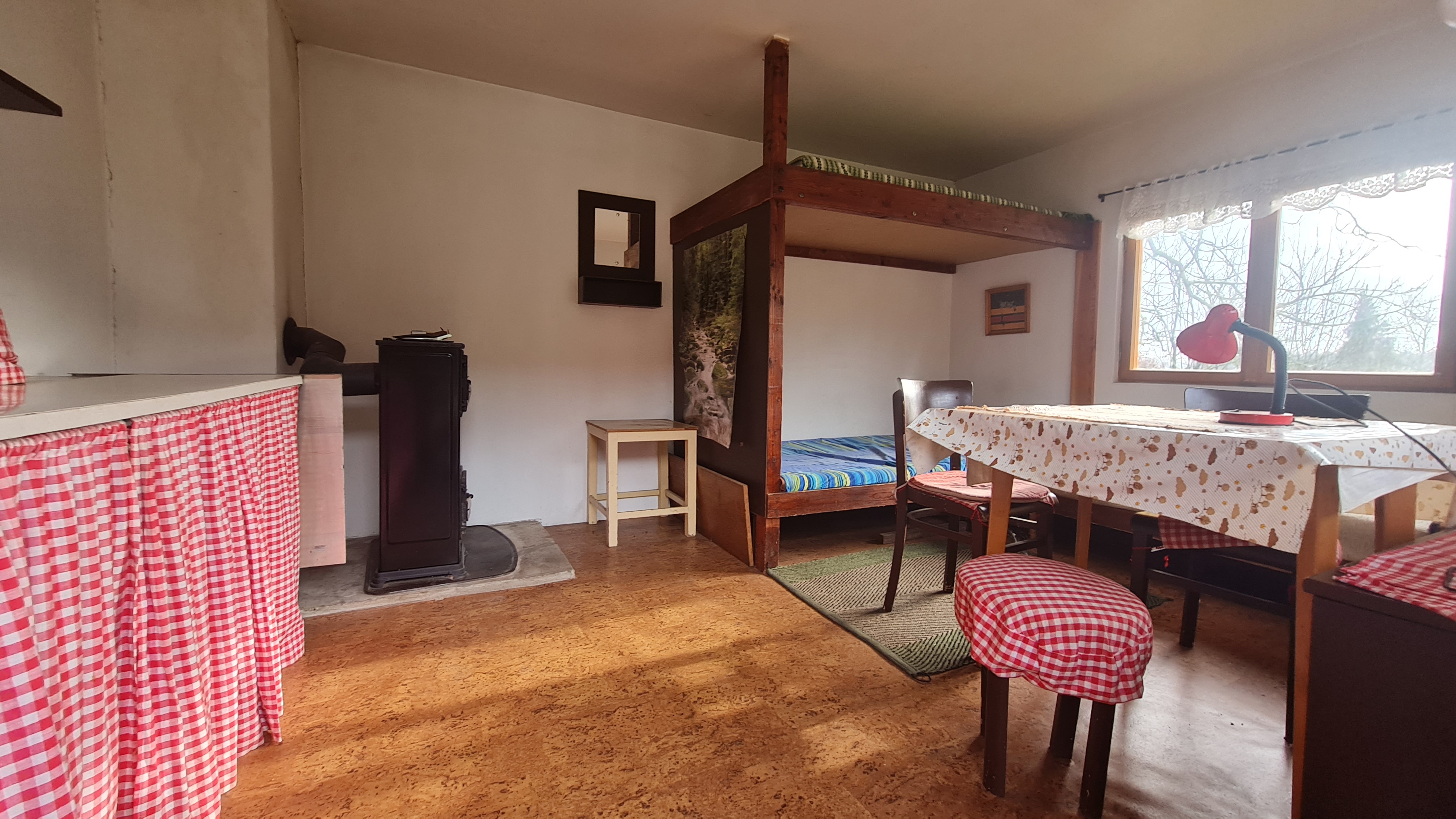 chata, která má spodní část zděnou, vrchní část je dřevěná, zateplená