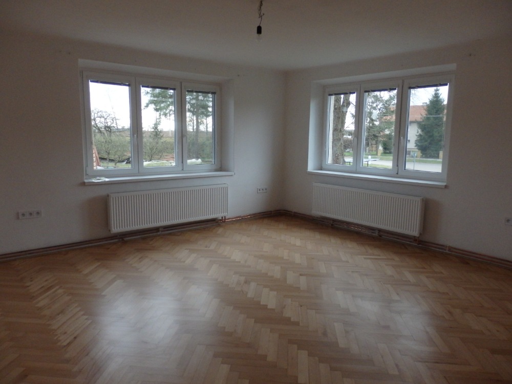 okna, nová koupelna s WC, podlahy - zrenovované parkety, PVC, dlažba, nový